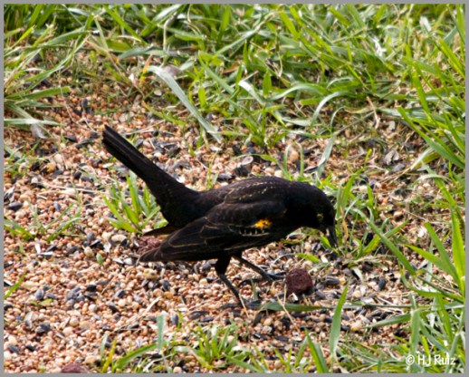 My backyard gets visited by Red-Winged Blackbirds occasionally. These birds are large and knock the feeders around to dump the seeds to the ground and eat.