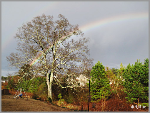 Photo of rainbow taken last month from my deck, see that tree? It's my best friend! Aprox. age 250 years!