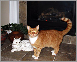 There’s a skinny N. Mockingbird that hangs out on our deck and comes to our patio door all the time, face to face with one of our cats (VanGogh – See photo in gallery)