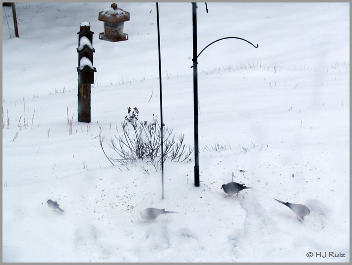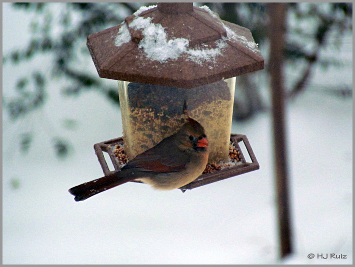 Last night we had a snow storm that covered our County, we usually don’t get snow in this area of Georgia. This morning I saw a bunch of birds walking around the feeders which were empty of seeds but covered with snow and ice. No bird could eat because the snow was covered with a thin layer of ice and the birds could only walk but unable to dig the ground. Ice was also blocking the holes where the seeds drop to the trays of the feeders. You should see thatat soon as I filled the feeders with seeds and cleaned them, a bunch of birds coming from all directions came to eat, it was a feast! 🙂