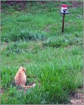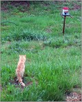 The tabby didn’t make a move so I decided to ended by going out and shooing the cat away. Then I refilled the feeders and before I went in the house I could see birds starting to fly toward the food. The cat went into the bushes in direction of the creek.