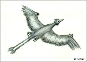 Is a genus of primitive crow-sized birds from the Early Cretaceous Yixian and Jiufotang Formations of China, dating from 125 to 120 million years ago. Like modern birds, Confuciusornis had a toothless beak, but close relatives of modern birds such as Hesperornis and Ichthyornis were toothed, indicating that the loss of teeth occurred convergently in Confuciusornis and living birds. It is the oldest known bird to have a beak. It was named after the Chinese moral philosopher Confucius (551–479 BCE). Confuciusornis is one of the most abundant vertebrates found in the Yixian Formation, and several hundred complete, articulated specimens have been found. Confuciusornis was about the size of a modern pigeon, with a wingspan of up to 0.7 meters (2.3 ft) and a weight of up to 0.5 kilograms. Fossils of Confuciusornis show that it had an exceptionally large humerus (upper arm bone), and a characteristic hole near its shoulder-end may have reduced the bone’s weight. The furcula or wishbone was a simple bar, like that of Archaeopteryx. The sternum (breastbone) was relatively large and had a low keel which was raised at the back end. This bony keel may or may not have anchored a larger, cartilaginous, keel for enlarged pectoral muscles. The scapula (shoulder blades) were fused to the coracoid bones and may have formed a solid base for the attachment of wing muscles. The orientation of the shoulder joint was sideways, instead of angled upward as in modern birds; this means thatConfuciusornis was unable to lift its wings above its back. Like Archaeopteryx, it was thus incapable of the upstroke required for flapping flight.