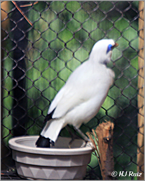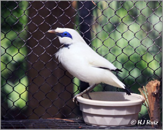 This bird is also known as Rothschild’s Mynah, Bali Myna, or Bali Mynah, locally known as Jalak Bali, is a medium-sized (up to 25 cm long), stocky myna, almost wholly white with a long, drooping crest, and black tips on the wings and tail. The bird has blue bare skin around the eyes, greyish legs and a yellow bill. Both sexes are similar.