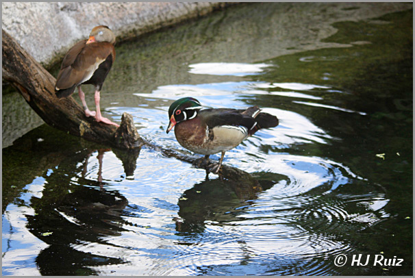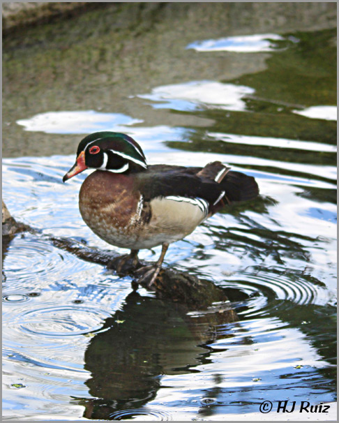 The adult male has distinctive multicoloured iridescent plumage and red eyes,with a distinctive white flare down the neck. The female, less colourful, has a white eye-ring and a whitish throat. Both adults have crested heads. When swimming, Wood Ducks bob their head back and forth in a jerking motion, which makes them easy to spot.