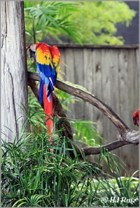 Three subspecies present varying widths in their yellow wing band. There is bare white skin around the eye and from there to the bill. Tiny white feathers are contained on the face patch. The upper mandible is mostly pale horn in color and the lower is black. The only difference between ages is that young birds have dark eyes, and adults have light yellow eyes. It is frequently confused with the slightly larger Green-winged Macaw, which has more distinct red lines in the face and no yellow in the wing. Scarlet Macaws make very loud, high & sometimes low-pitched, throaty squawks, squeaks and screams designed to carry many miles to call for their groups.Scarlet Macaws eat mostly fruits, nuts and seeds, including large, hard seeds. A typical sighting is of a single bird or a pair flying above the forest canopy, though in some areas flocks can be seen. They may gather at clay licks. They like nuts and fruits. They also feed on nectar and buds.