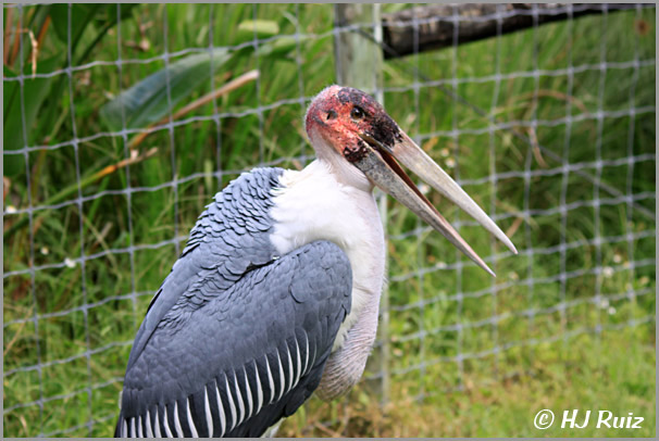 The Marabou Stork is a frequent scavenger, and the naked head and neck are adaptations to this, as it is with the vultures with which the stork often feeds. In both cases, a feathered head would become rapidly clotted with blood and other substances when the bird’s head was inside a large corpse, and the bare head is easier to keep clean.