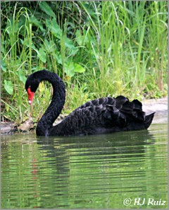 This is a large waterbird, a species of swan, which breeds mainly in the southeast and southwest regions of Australia. The species was hunted to extinction in New Zealand, but later reintroduced. Within Australia they are nomadic, with erratic migration patterns dependent upon climatic conditions. Black Swans are large birds with mostly black plumage and red bills. They are monogamous breeders that share incubation duties and cygnet rearing between the sexes.