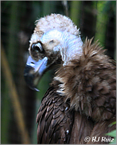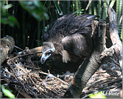 It breeds in high mountains and large forests, nesting in trees or occasionally on cliff ledges. It has all dark blackish-brown plumage, and even at a distance can be distinguished from the Griffon Vulture by its evenly broad “barn door” wings. It has the typical vulture unfeathered bald head (actually covered in fine down), and dark markings around the eye give it a menacing skull-like appearance. The beak is brown, with a blue-grey cere, and the legs and feet are grey.