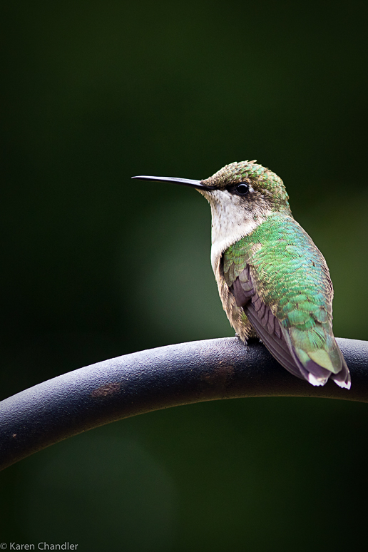 A juvenile male hummingbird has claimed a feeder just outside my porch door. I like to observe his behavior as he guards his territory, feeds, and rests. For this series of photos, I wanted to show the variety of positions he takes as he perches on a shepherd’s hook just above his feeder. He does not mind my presence, even though my tripod is six feet from his perch. He is, however, curious each time I touch or stand close to his feeder. He swoops close to me and another bird usually follows him for a second near miss of my head!
