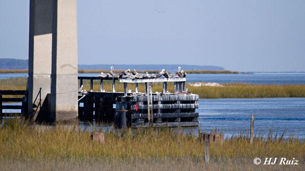 This group of Brown Pelicans are basking under the sun and at the base of a bridge uprights. Shot with a Canon 60D camera f/ 6.3 – 1/250 – ISO 125