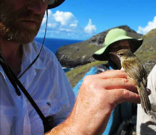 A Nihoa Millerbird perches on the hand of Dr. George Wallace, ABC's Vice President for Oceans and Islands. Photo, USFWS