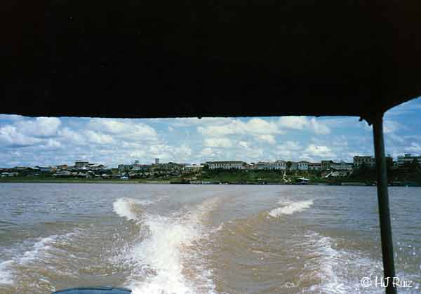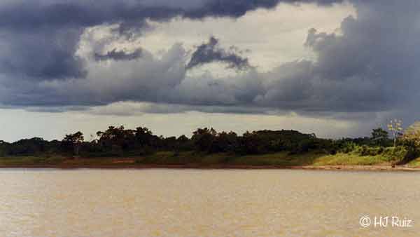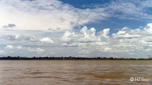 While navigating the Amazon river we experienced the torrential downpours that can hit you any time when water-heavy clouds appear appear in the sky. The river’s water turns chocolate color because of the mud. After a few minutes the sun comes out again and the humid heat envelopes you again. Vegetation is abundant, when seen from the sky the jungle is like a green sea as far as you can see in the horizon and the river is like a giant brown snake undulated and endless.