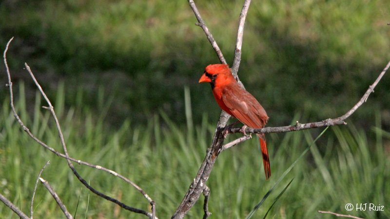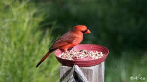 Northern Cardinals have been a permanent fixture in my backyard since I moved to my new house six years ago. I now they keep their nests in a row of pines along the creek, these pines must be approximately 25 ft. high and fairly close together, making the perfect setting for their nests. I don’t bother looking for them I rather see them flying or feeding. These birds are very beautiful with a striking appearance, bright colors and the black mask.