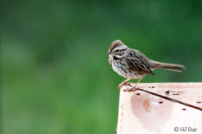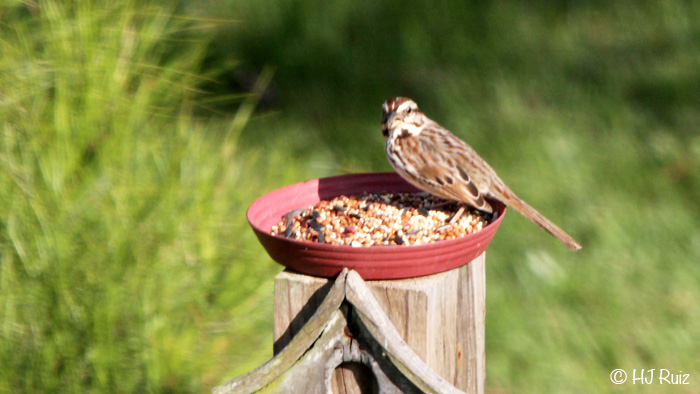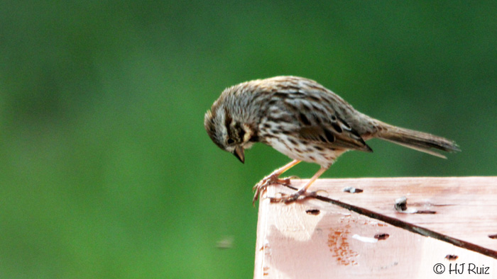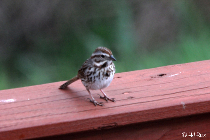 I see the Song Sparrows almost daily, scurrying around between bushes, plants, under the deck, flower pots. They love to forage around.