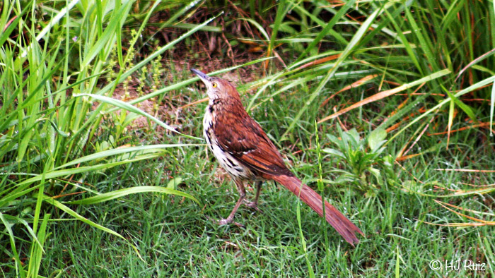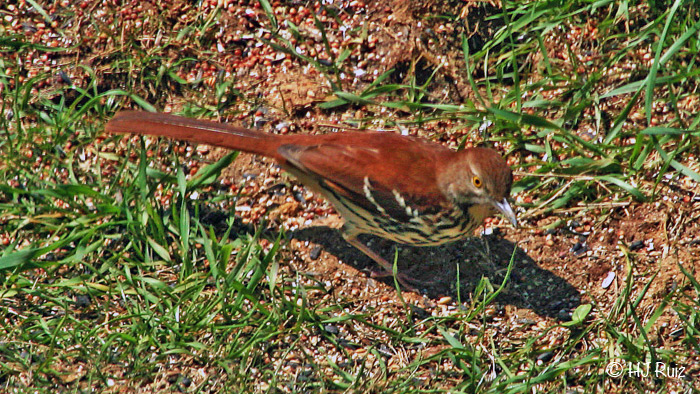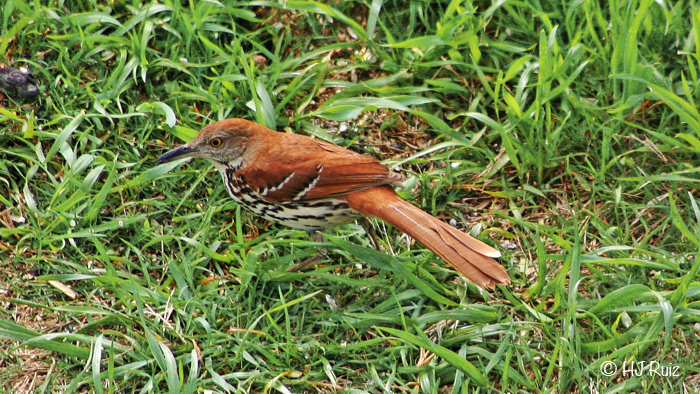 The Brown Thrasher is a bird that I see in my backyard usually after a heavy downpour. It uses its long and strong bill to pull earthworms and other bugs that come out after heavy rains. This bird walks fast and scurries around the whole area. It uses its bill to pock the ground until getting the worm out which then swallows in one gulp. The Brown Thrasher is the official State of Georgia bird, if you didn’t know. Rufus-Brown head, rump and tail, wings has lighter bars. It has a dark streaked breast and buffy underparts. Its eyes are bright gold. They usually nest in dense brush, they are partial migratory.