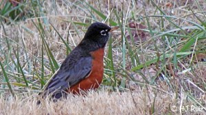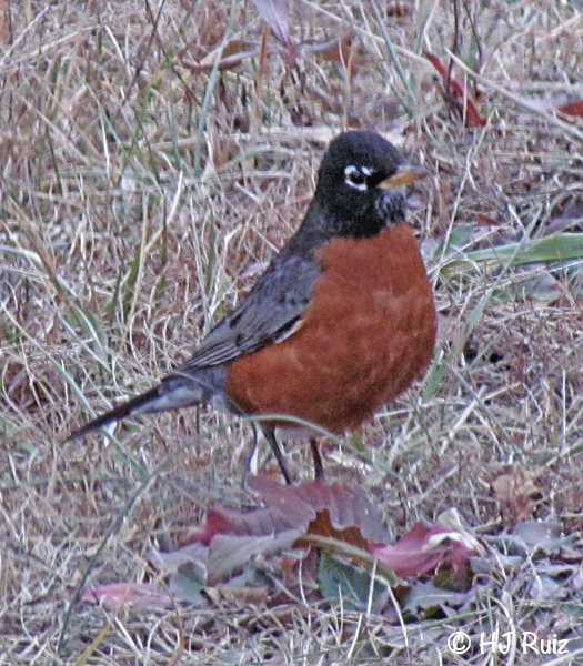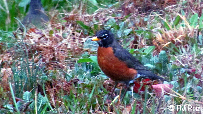 If there’s something I like to do when I see birds is to observe their patterns of behavior. In the case of the bird I picked for today, the mid-size American Robin with their rusty brown breasts and black head, back and tail. Their black eyes present  white crescents around them which make them peculiar. The have a sharp pointy yellow bill made to resist pocking the ground hard.