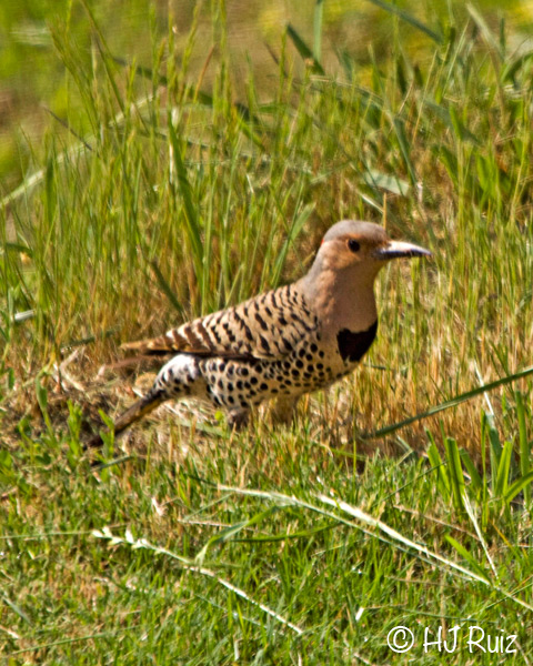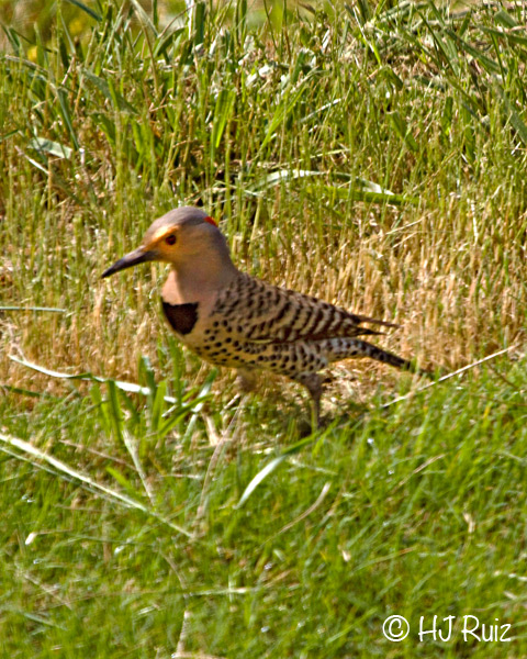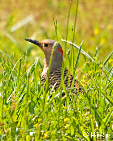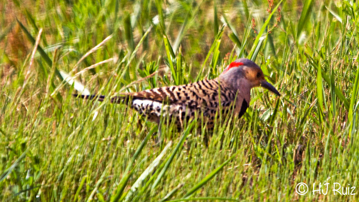 Another bird that I see once in a while strolling my backyard is the Northern Flicker. Is a medium-sized member of the woodpecker family. It is native to most of North America, parts of Central America, Cuba, the Cayman Islands, and is one of the few woodpecker species that migrate.
