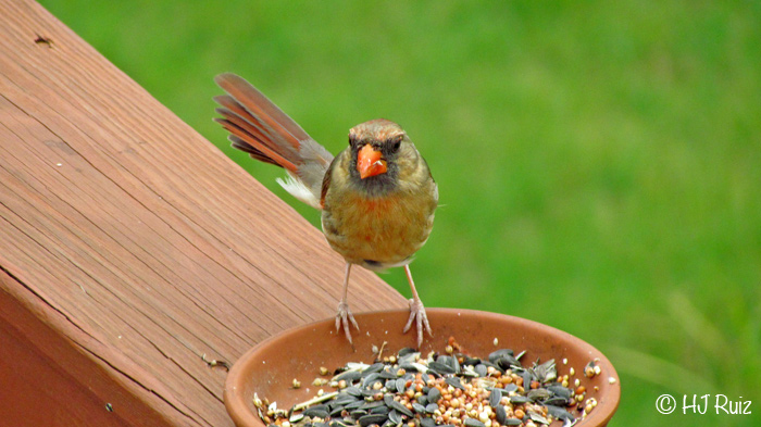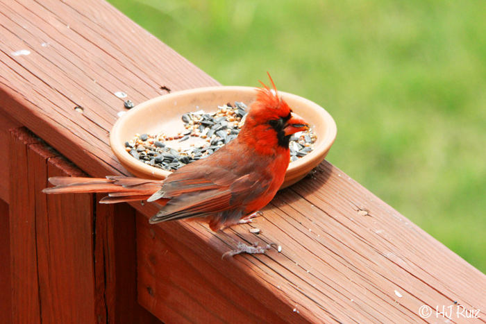 My backyard is getting over populated by Northern Cardinals! They are all over the place, flying from here to there and chasing each other, at the feeders, on my deck. Seems to me that the families that are residents have grown to larger families. I’m not complaining at all! I’m merely reporting what I see in my backyard. I love these birds!