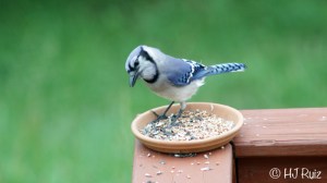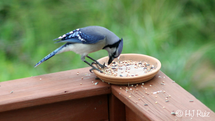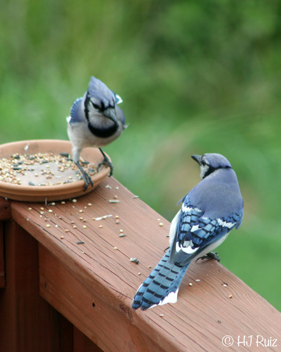 This time they were all over the place, eating my sunflower seeds, playing around and even feeding each other with their bills. It was like music for the eyes. In one side we had the Blue Jays and in the other side all the Northern Cardinals but not antagonizing at all. There were two parties of separate groups.
