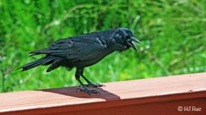 The most usual call is a loud, short, and rapid caaw-caaw-caaw. Usually, the birds thrust their heads up and down as they utter this call. American Crows can also produce a wide variety of sounds and sometimes mimic noises made by other animals, including other birds.