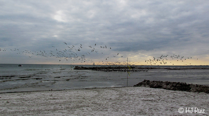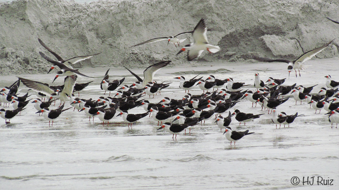 Large flock of Black Skimmers in flight and on sandbar