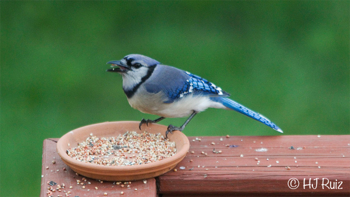 I miss blue jays. They were back yard pests in Texas although my wise old grandmother (MWOG) and I loved them. When I went off to college at Texas A&M University, the college bookstore had a special section which basically was where students could buy interesting and unusual things for their parents. I bought a limited edition of porcelain bluejays. You can see part of them in the upper left corner of the first picture in my post at http://russelrayphotos2.com/2012/06/17/i-told-myself-i-couldnt-do-it-what-did-i-know/. When MWOG died in 2003, I got the bluejays back. They are #111 by Andrea by Sedak (might be Sadek). I remember how my checking account was aching when I bought those darn birds but I sure like them now that they are mine!