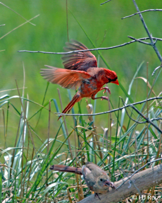 Male N. Cardinal chasing the female!