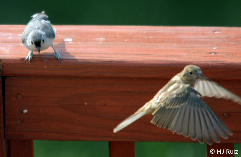 Tufted Titmouse seeing female House Finch going for the feeder!