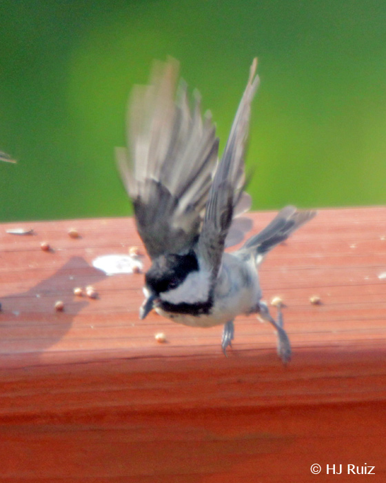 Carolina Chickadee picks one sunflower seed and does a super fast departure!