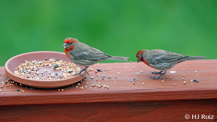 There are two male House Finches (J) that are together all the time, they do the same things together it’s like mirror image sometimes. They look identical.