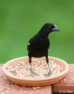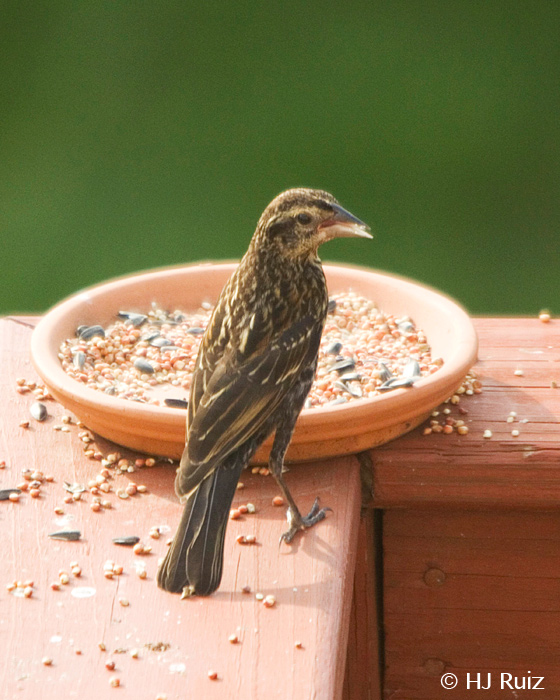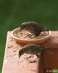 The Red-winged Blackbirds are a species that stop by my backyard regularly. When they show up everything goes out of whack!. They make a mess with seeds because they love to scratch and select their favorite seeds, I feed the birds with mixes of several seeds so every bird get to eat what the usually eat.