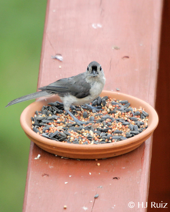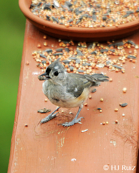 The Tufted Titmice are almost complete with process of molting and are also getting larger in size. These birds have become regular residents of my backyard and are consistent “customers” at my feeders. They eat only sunflower seeds and are experts at cracking them open. They are not birds that hang out at the feeders, generally, they pick one sunflower seed and fly back to their nest or a far branch to crack the seed, then come back to the same spot and repeat the action. A few seasons back I had a hard time to photograph the Tufted Titmice for the reason that it was to fast and stayed put too short of a time. Once I studied his habits I had no problem at all. They are nice birds!