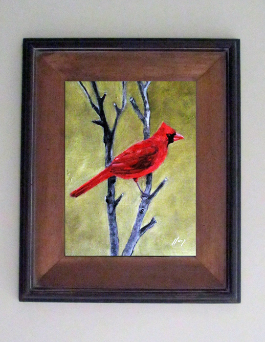 “Male Northern Cardinal” Oil on gessoed masonite board, 9×11, framed in wood