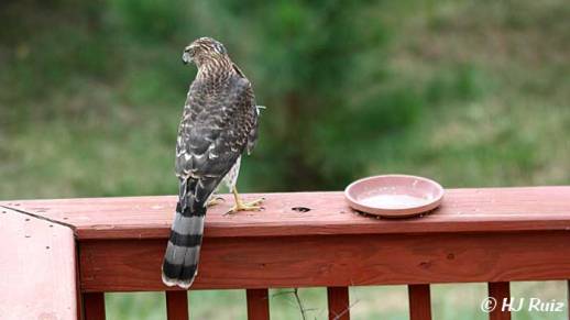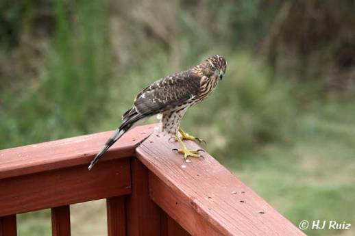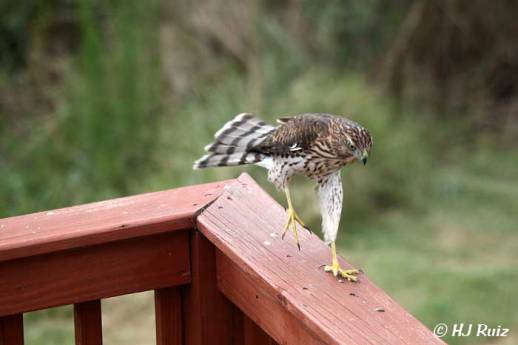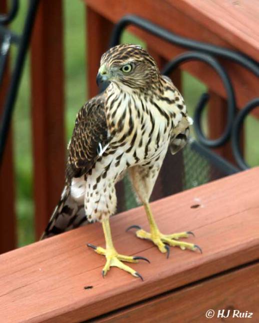 It was a Cooper’s Hawk. I started shooting with excitement and trying to do the best of the situation, the hawk kept moving around the deck checking for movement with those piercing eyes.