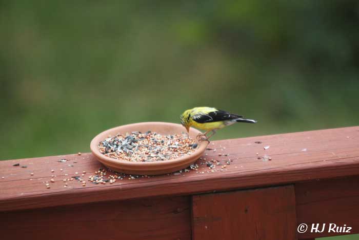 - American Goldfinch eats seeds from dish undisturbed