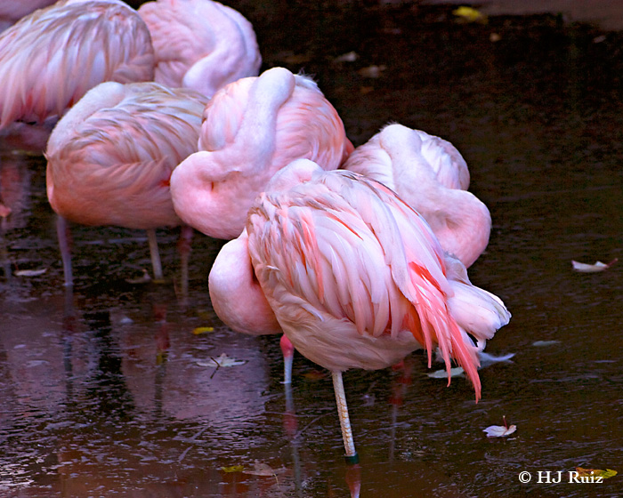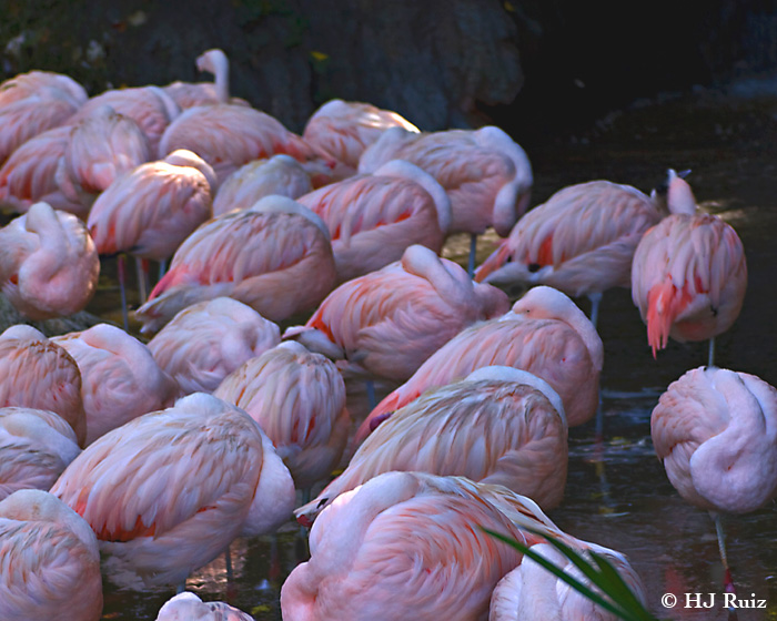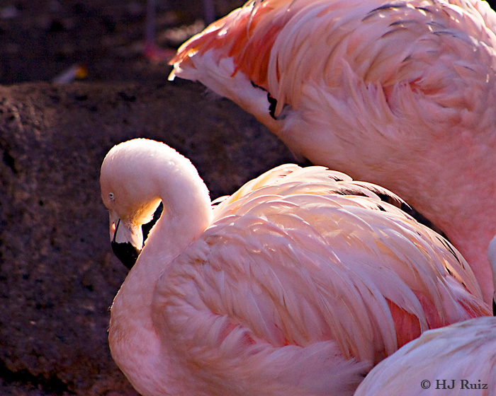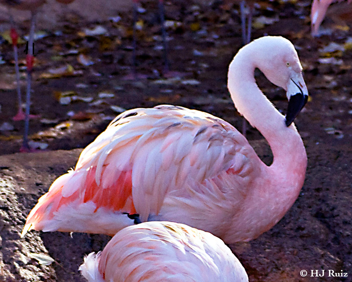The plumage is pinker than the slightly larger Greater Flamingo, but less so than Caribbean Flamingo. It can be differentiated from these species by its greyish legs with pink “knees”, and also by the larger amount of black on the bill (more than half). Young chicks may have no sign of pink coloring whatsoever, but instead remain grey.