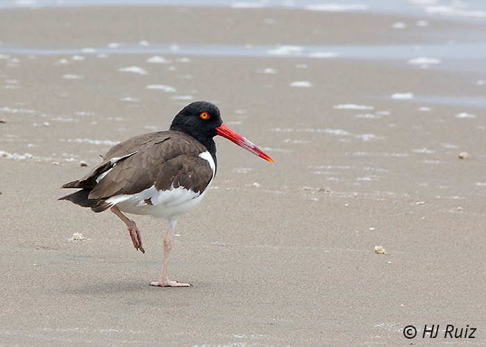 The American Oystercatcher (Haematopus palliatus), occasionally called the American Pied Oystercatcher, is a member of family Haematopodidae. The bird is marked by its black and white body and a long, thick orange beak. This shorebird is approximately 19 inches (42 – 52 cm) in length.