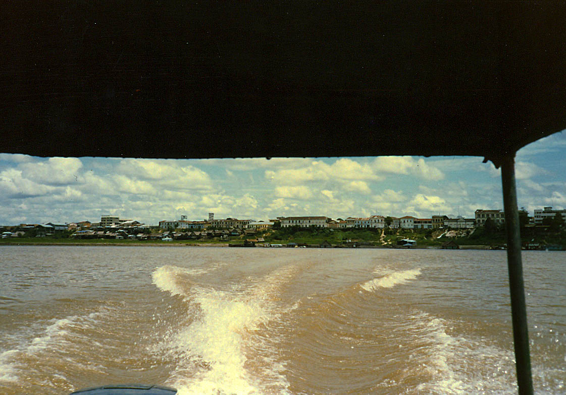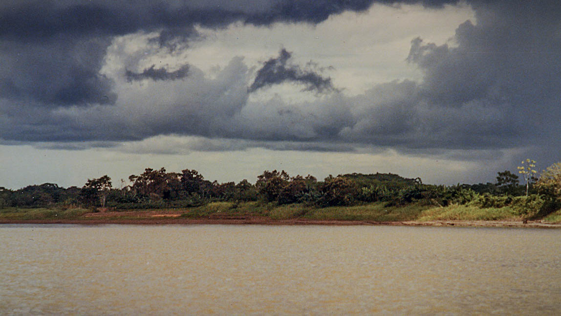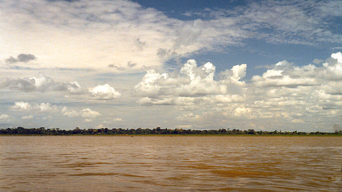 Leaving Iquitos port heading east navigating the Amazon river.