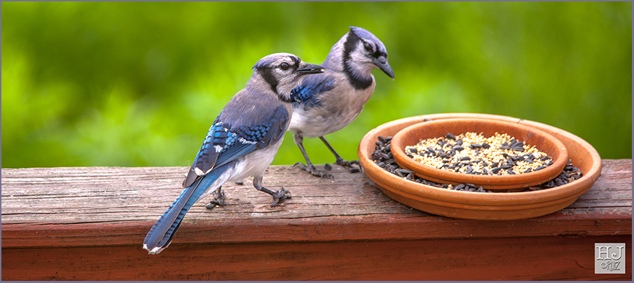 The Blue Jays are usually accompanying other blackbirds such as Cowbirds, Red-winged Blackbirds, European Starlings, etc. They travel together and eat together. Blue Jays are very cautious about being at open air, they hide on tall trees and observe for a while before flying down to eat. One particular eating habit is to gobble several nuts or large seeds in their bill and then go hide and eat. Their plumages are incredibly attractive with patterns in shades of blue, also black markings on head and neck all combined with white a a bit of gray. Cool!L-015