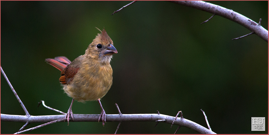 She’s still young, notice her bill is still dark and eventually will turn red with a bit more age. She is young and very pretty! The cardinals families in my backyard are numerous. They are local residents for many years.