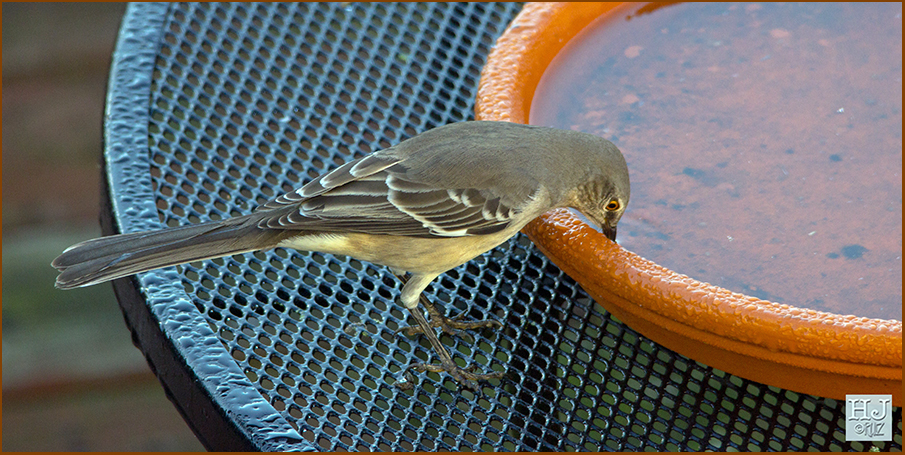 My friend the Northern Mockingbird is back, after some days being absent, He looks to be in great shape too! He was eating some peanuts right before you came and now he’s drinking some much needed water. This fellow is my security deputy that keeps the backyard safe from aggressive intruders. I know that he was out for a few days tending his nest where he has new hatchlings. Across the road in my neighbor’s tree. Congratulations!L-068