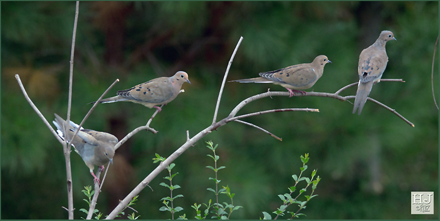 Note: Please look to the far right! See those Mourning Doves? They also are local birds that love to hang out in this corner, they are very close tied group. This picture will have them together for posterity. I know, they eat too much but what the heck!…I love ‘em all!L-070