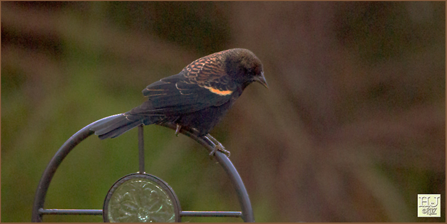 Look to your farther left! Can you see it? That is a male Red-winged Blackbird, I thought they were gone already! He’s here alone, hmm…rare. He must be late or lagging behind, I do notice that his plumage shows he’s still young and non-breeding. Maybe he’s just getting some food and will catch up with his flock soon. Bon Voyage young fellow!L-073
