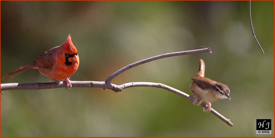 There he is my dear friend Northern Cardinal (male), he’s one that went through a lot when he got wounded and lost one foot. I don’t know under what circumstances but I’m so happy that he pulled trough and look at him now! L-121He’s a strong and good looking bird. He can do almost everything that the other birds can do. I’m proud of him and he’s always round the backyard. Next to him is my good helper Carolina Wren that spruce up the fallen seeds on the deck’s floor. These two friends are terrific!