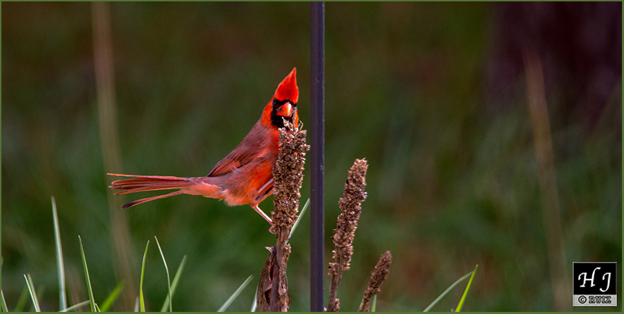 There in the far left lower side! That’s a great looking superstar in my backyard. Non other than a Northern Cardinal! I’ve been very lucky with them, there’re several families of these birds nesting in my backyard. They came once and they stayed ever since. I’ve seen many generations of cardinals raised here. I love them very much!