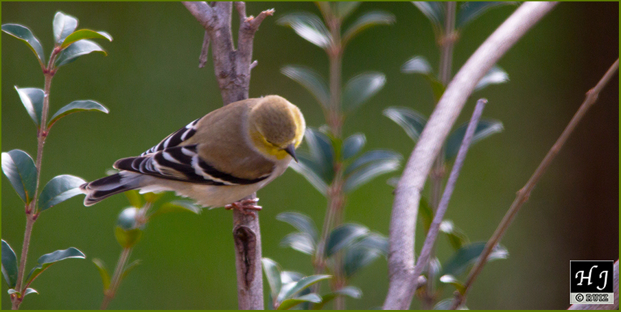 Here we go, look at the American Goldfinch on the left, semi hidden behind the leaves. The bird is waiting for the opportunity to grab a meal from the feeder saucer on the deck. This individual is part of the group that did not migrate. The sun is shining a bit at this moment.L-133