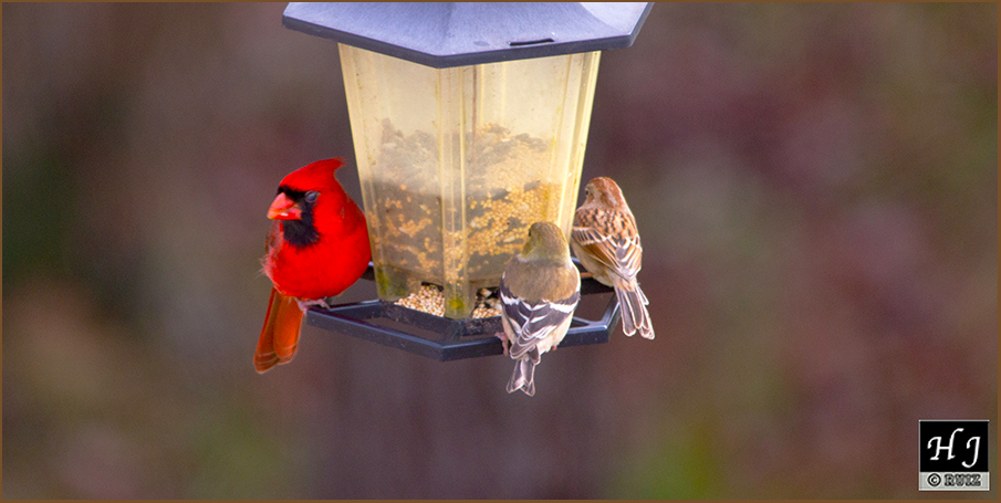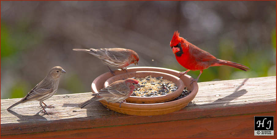 There are three House Finch members of a larger family, partaking with a male Cardinal on the deck. They have no problem to feed from the same seeds saucer. When things get tough it’s best to be humble and share with your peers.