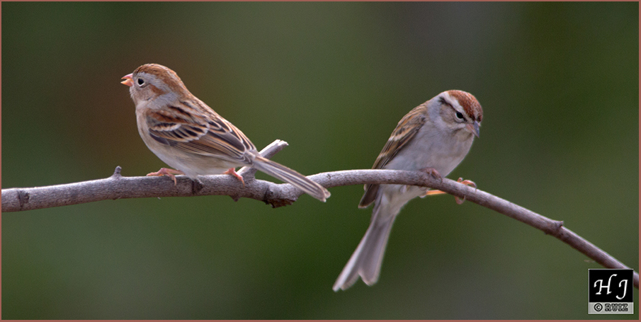 Now, look at that! That’s camaraderie at its best. Great friend next to each other. A Field Sparrow on the left and a Chipping Sparrow on the right. Just two friend chatting a bit! Good for them!