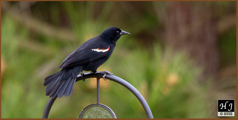 Look over to the left, can you see that handsome male Red-winged Blackbird? Isn’t he a perfect looking bird? RWBs are coming to eat everyday in groups and they are all over making their “macho calls” and showing off their red shoulder epaulettes. I haven’t seen any females yet!L-178