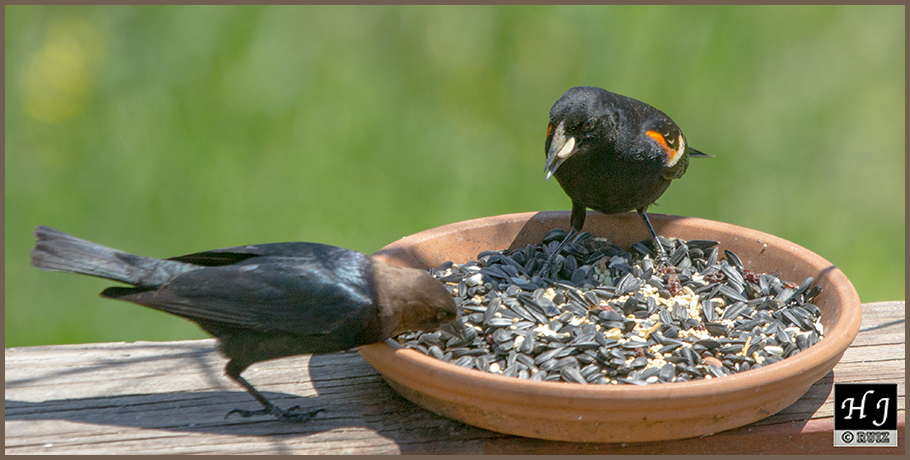 Welcome my dear friends, my window is ready for you to take a look outside! Over there! On the deck’s handrail, at the feeder, one Brown-headed Cowbird (M) and a Red-winged Blackbird, also male. They are sharing a meal of delicious seeds, courtesy of HJ!L-187